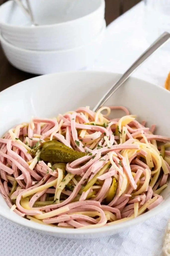 Original bayrischer Wurstsalat Rezept mit Käse und Dressing – klassischer Wurstsalat mit Lyoner, Emmentaler, Gewürzgurken und Essig-Öl-Dressing pinit