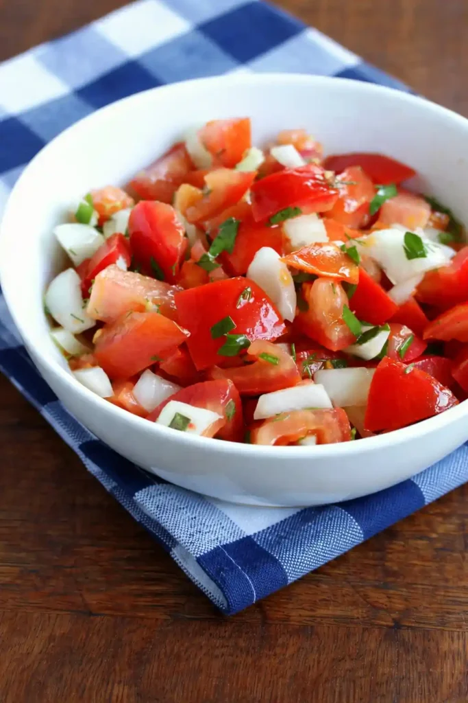 • Die richtige Schnittgröße wählen – Größere Tomatenstücke bleiben saftiger und geben dem tomatensalat rezept mit zwiebeln eine bessere Textur.